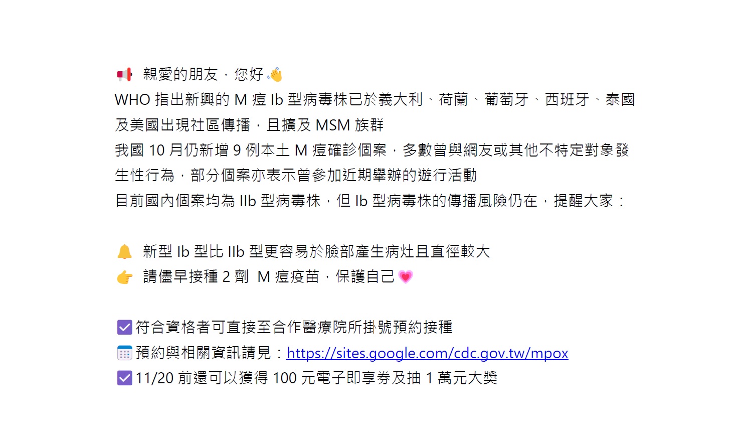疾管署製作MPOX防治Line宣導圖文1則,請協助轉知相關訊息宣導